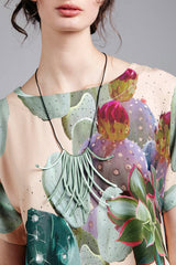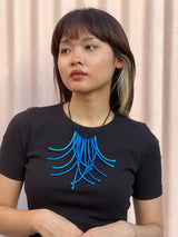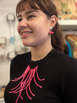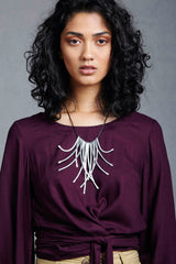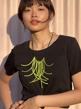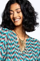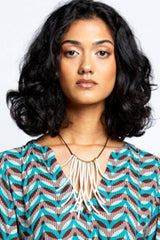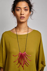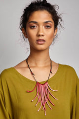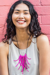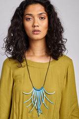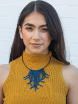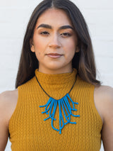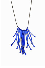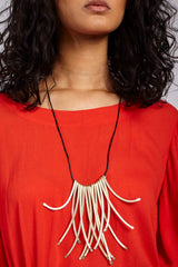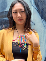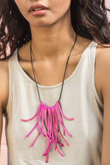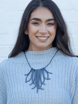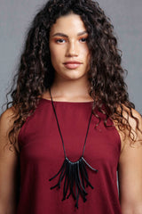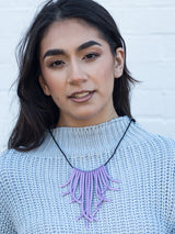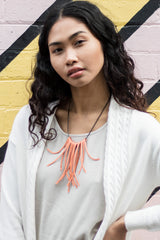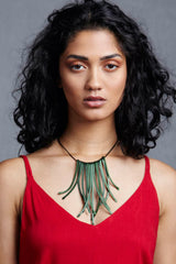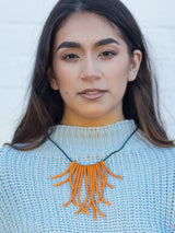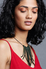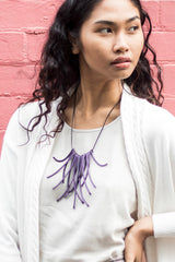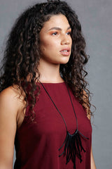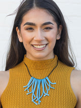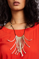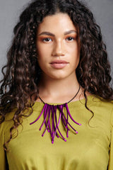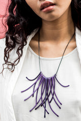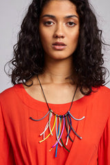 Monica Krexa's necklace is made in Brazil and crafted from lightweight recyclable anodized aluminium. Pieces of the metal have been cut at different lengths and bent slightly to to form a fun fringed design. Adjustable vegan leather neckbands are featured to allow you to wear your necklace at any length.